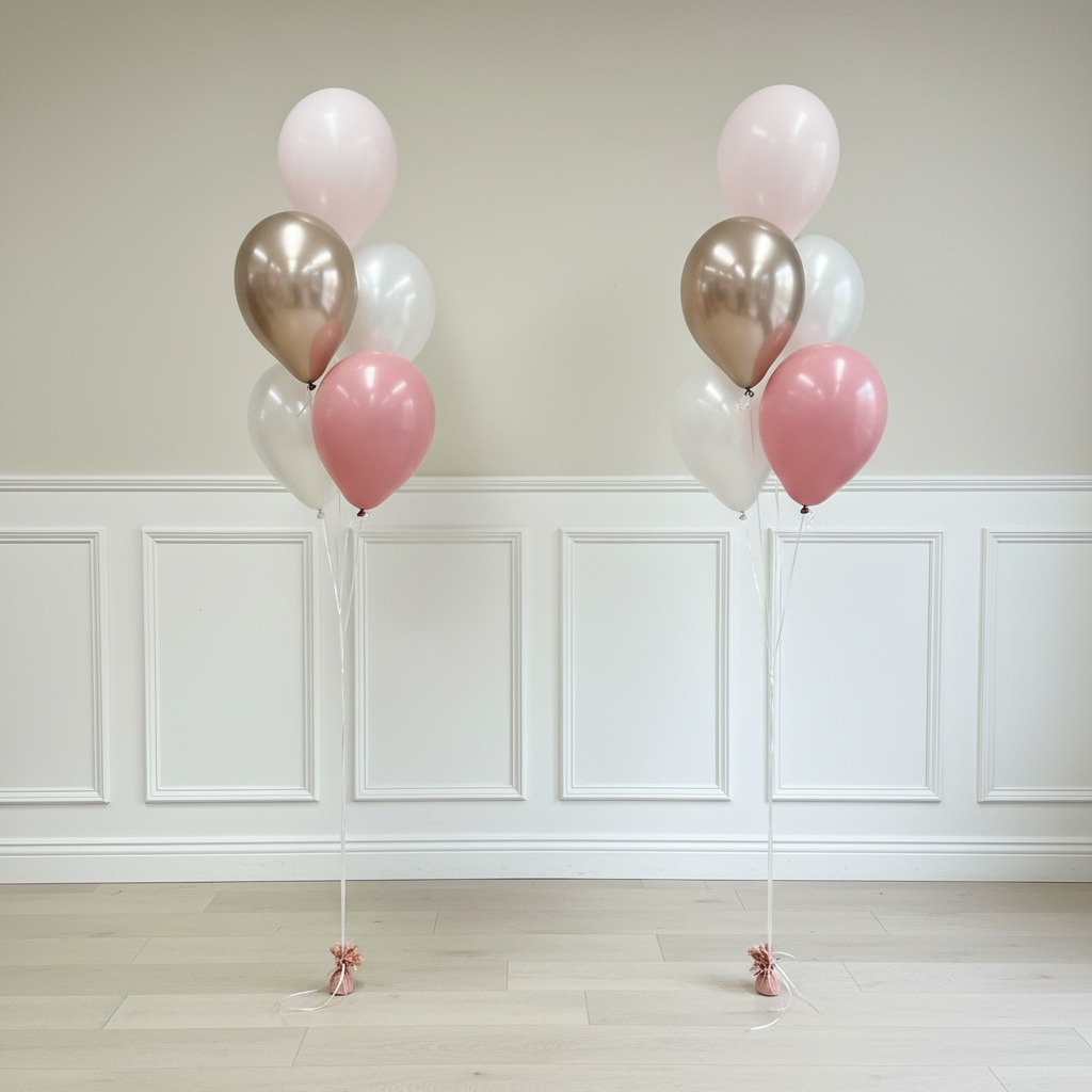 Deze tros bestaat uit 5/6 of7 latex ballonnen (eventueel behandeld met hi-float voor een langere zweefduur). Wordt geleverd op een ballongewichtje.