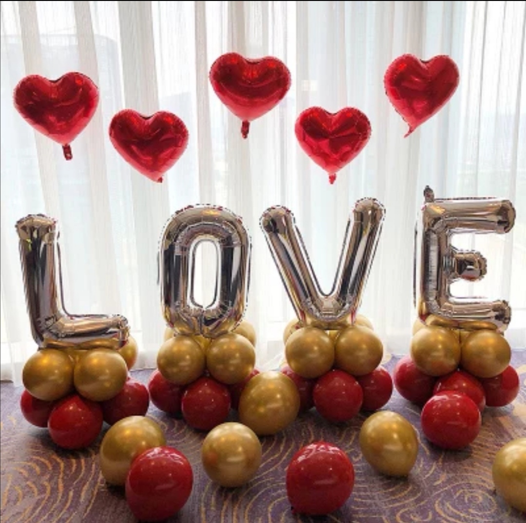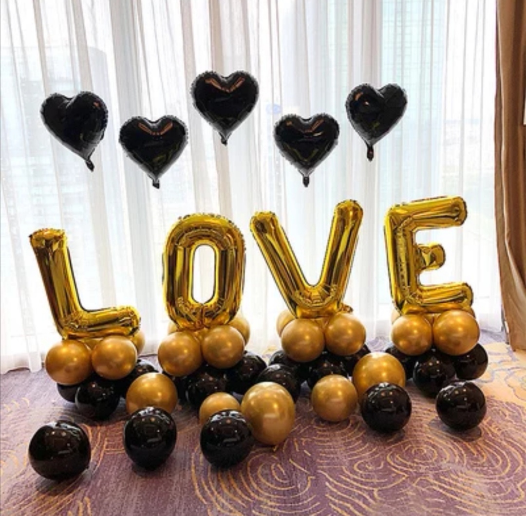 4 letterblokken, 5 helium harten op gewicht, en 9 luchtgevulde latex ballonnen.