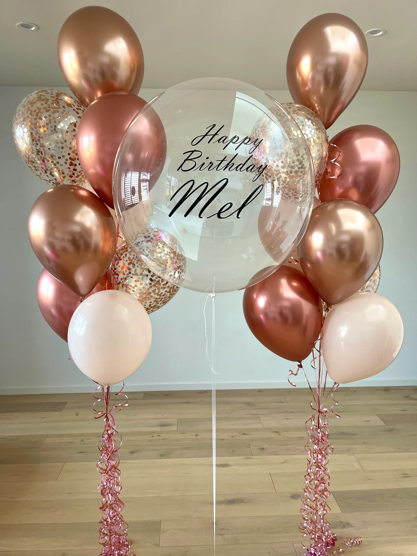 De ballon bouquets bestaan uit ieder totaal 8 ballonnen met 2 kleuren Rosegold, Cream en daarbij 2 confetti ballonnen.