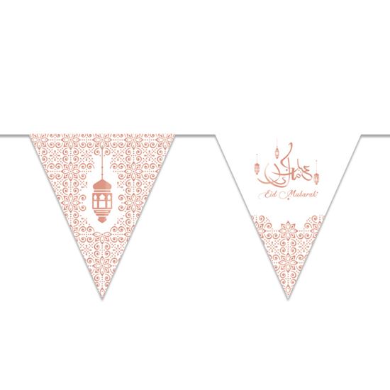 Vlaggenlijn met papieren puntvlaggetjes, bedrukt met ‘Eid Mubarak’. De vlaggenlijn heeft een totale lengte van 3m. Eid Mubarak is een traditionele Islamitische groet die letterlijk vertaald ‘gezegende feestdag’ betekent. De groet kan slaan op zowel het Suikerfeest als het Offerfeest. Datum Suikerfeest 2021: van ’s avonds woensdag 12 mei tot ’s avonds donderdag 13 mei. Datum Offerfeest 2021: van ’s avonds maandag 19 juli tot ’s avonds vrijdag 23 juli.